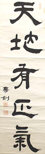 紙本肉筆・・縦130cm、横34cm 「無劍」の下に、陰刻「渡邊千冬」と陽刻「無劍」の 落款が押されている。渡邊無劍は長野の人で、 名は千冬、号を無剣と称し、日本製鉄所・日仏銀 行等の取締役を務めた後、政界に転じて濱口・若 槻の各内閣で法務大臣を務めた人で、子爵の実 業家にして政治家であるが、能書家としても知る 人ぞ知る人物で、将棋の駒の字母を揮毫してお り、明治から大正にかけて活躍した駒師の初代 豊島龍山が残した「字母長帖」には、「前司法大 臣渡邊千冬 号無劍」と記載されており、それに 因れば、表は隷書で裏は篆書のコラボレーション で、特に歩の「と金」の篆書が独特である。 |
