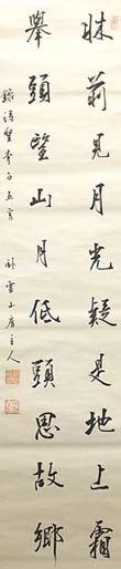 紙本肉筆・・縦135cm、横32cm 「臥雲山房主人」の下に、陰刻「讀聖覧書」と陽刻「此 趣人不疑」の落款が押されている。梨岡素岳は香川 の人で、本姓は野生司氏、名は南寿太郎、字は子辰、 号を素岳・月梅居士・覚非庵・臥雲山房などと称し、漢 学を村尾篁山に、書と篆刻を鎌田玄斎に学び、陸軍に 入営するも35歳の時に陸軍少尉で退役し、上京して 書を久志本梅荘に、篆刻を五世浜村藏六に学び、石 井雙石や太田夢庵らと「長思印会」を結成し、雑誌『彫 蟲』を創刊して活躍した篆刻家である。 |