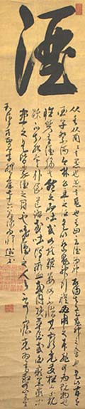紙本肉筆・・縦125cm、横27cm 「南屏七十六翁源爲祥述書」の下に、陽刻「和漢開闢以 本神言古正名學中興之祖」と陰刻回印「源爲祥印」の落 款が押されている。座光寺南屏は甲斐の人で、名は爲 祥、字は履吉、号を南屏・龍園などと称し、初め業を五味 釜川に受け、古文辞を研鑽して自家独特の古文復古を 唱え、後に医を香川南洋に学び、私塾桐華書屋を開いて 講説に従事し、書にも優れた儒者で、五十種以上の書物 を著している。 |