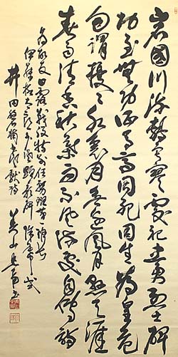紙本肉筆・・縦140cm、横65cm 「美山照陽書」の下に、陰刻「美山要蔵」と陽刻「 照陽」の落款が押されている。美山照陽は東京の 人で、名は要蔵、号を照陽と称し、陸軍士官学校 卒業後、騎兵少尉となり、関東軍参謀・参謀本部 編制動員課長・南方軍作戦課長・陸軍省高級副 官等を歴任した、陸軍大佐の軍人で、戦後は第1 復員局文書課長・厚生省援護局長等を務めて旧 軍の後始末を一手に引き受け、遺骨収集・靖国 合祀・千鳥が淵戦没者墓苑創設等の事業に関与 し、晩年は千鳥が淵戦没者墓苑の奉仕会理事長 を務めている。 |