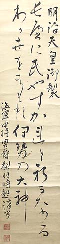 紙本肉筆・・縦136cm、横33cm 「海軍中将男爵梨羽時起謹書」の下に、 陰刻「海軍中将」と陽刻「梨羽時起」の 落款が押されている。梨羽時起は長州 の人で、長州藩武術指南役有地藤馬の 四男で梨羽の養子となり、戊辰戦争に 従軍した後、鉄道・内務関係で測量に 従事し、その後海軍に入り、海防艦分 隊長・巡洋艦副長・砲艦艦長・巡洋艦艦 長・呉海兵団長・常備艦隊司令官・第1 戦隊司令官・馬公要港部司令官等を歴 任した、海軍中将の軍人である。 |