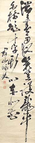 紙本肉筆・・縦130.5cm、横33.5cm 「君山咏史」の下に、陰刻「藤野静輝」と陽刻「君山 」の落款が押されている。藤野君山は伊予の人で 、名は静輝、号を君山と称し、松山藩藩校明教館 学寮長や江戸昌平黌舎長などを務めた儒者、藤 野海南の子で、太政官を務めた後、歴史研究の 為に各地を周遊し、詩歌・文章・俳吟・書画を善く した、文人教育者の漢詩人にして書家で、乃木希 典らと交わり、大正天皇より賜った菊に因んで賜 菊園を主宰している。 |