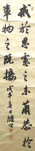 絖本肉筆・・縦124cm、横35cm 「随郷」の下に、陰刻「武營之印」と陽刻「随郷」の落 款が押されている。中野随郷は讃岐の人で、名は武 營、号を随郷と称し、高松藩勘定奉行中野武憲の長 男で、藩校講道館に学び、維新後は内務省に入って 地租改正作業に当たり、農商務省権少書記官とな るも、政界に転じて愛媛県議から衆議院議員となり、 更に関西鉄道社長・日清生命社長・代二代東京商 業会議所会頭等を歴任した、政治家の実業家であ る。 |