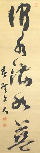 絹本肉筆・・縦114cm、横32cm 「春畦逸人」の下に、陰刻「山紫閣主」と陽刻「春 畦逸士」の落款が押されている。諸井春畦は武 蔵の人で、名は直行、通称は時三郎、字は習卿 、号を春畦と称し、諸井泉衛の三男で、上京して 経済学を修め日本初のビルブローカー業を始め た実業家であるが、西川春洞に書を学び、古法 帖の研究に通じて妻華畦と共に「春洞門の七福 神」と称され、豊道春海らと謙慎堂同窓会を結成 して活躍した書家でもある。尚、本品に押されて いる三個の印象は、初世中村蘭台(1856〜19 51)が刻したものである。 |