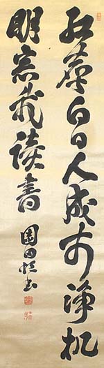 絖本肉筆・・縦129cm、横39cm 「園田恒書」の下に、陰刻「園田恒印」と陽刻「士徳氏」 の落款が押されている。園田天放は豊後の人で、名 は恒四郎、字は士徳、号を天放・牛山人などと称し、 森藩の儒者園田不時宜の子で、幼より家学を受け更 に武術も学び、維新後は大分師範学校に入学し、卒 業後は京都府中学・大阪府中学・福岡修猷館中学等 の教諭を歴任した漢詩人で、昭和十一年(1936)に は『園田天放先生遺稿』が出されている。 |
