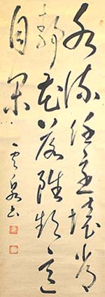紙本肉筆・・縦83cm、横29.2cm 「雲泉書」の下に、陰刻「???印」と陽刻「雲泉」の落 款が押されている。釧雲泉は肥前の人で、名は就、通 称は文平、字は仲孚、号を雲泉・魯堂・岱岳・六石など と称し、島原藩士の子で幼少より絵を好み、長崎の清 人から学問・画法等を学び、山陽・四国・上方・江戸・信 州・越後等を遊歴し、文人墨客と交流を重ね、旅に生き た孤高の画家である。尚、本品は「伝」の品である。 |