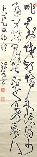 紙本肉筆・・縦135.5cm、横33cm 「鐸翁書」の下に、陰刻「鐸堂」と陽刻「都郷角印」の 落款が押されている。都郷鐸堂は阿波の人で、名 は角太郎、号を蠖堂・鐸堂などと称し、幼にして宮内 安芸に次いで田辺籠仙に学び、更に和歌山の倉田 何庵や森田無紘媼らに儒学を学び、帰郷して徳島 の小学校等に務めた漢学者にして書家で、特に草 書に優れて『筆道草新歌』『草訣百韻歌』『筆運七則 』等の著書が有る。 |