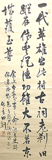 絖本肉筆・・縦136.5cm、横50.8cm 「竹香田鉚」の下に、陰刻「田部井鉚印」と陽刻「竹香」 の落款が押されている。田部井竹香は尾張の人で、名 は鉚太郎、号を竹香と称し、南画家牧野敏太郎(186 1生)の南画の師であり、『古今内外弔祭文範』(明治 28)・『明治才媛新体詩』(明治38)・『古今中京画談』 (明治44)・『犬山陶器誌』(大正6)等を公刊した、南画 家にして文筆家であるが、生卒等詳細は不明である。 |