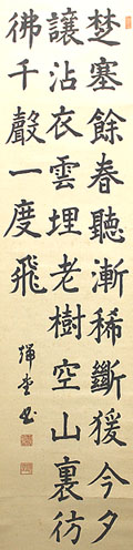紙本肉筆・・縦133cm、横33cm 「端堂書」の下に、陰刻「百武源吾」と「端堂」の落 款が押されている。百武端堂は佐賀の人で、名は 源吾、号を端堂と称し、佐賀藩足軽の五男で、海 軍兵学校卒業後、巡洋艦航海長、分隊長、艦長 ・教育局第1課長・軍令部第1班長・第5戦隊司令 官・軍令部次長・第3艦隊司令長官・艦政本部長 ・横須賀鎮守府司令長官等を歴任した、海軍大 将の軍人で、退役後は第7代九州帝大総長を務 めている。 |