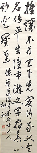 紙本肉筆・・縦137cm、横32.7cm 「榴邱」の下に、陰刻「常盤大定」と陽刻「榴邱」の 落款が押されている。常盤榴邱は宮城の人で、 名は大定、号を榴邱と称し、東京帝大卒業後、同 大教授や東方文化学院研究院等を歴任し、中国 仏教史蹟の調査を行い、『中国文化史蹟』『支那 に於ける仏教と儒教道教』『支那仏教の研究』等 を公刊した、中国仏教史研究者であるが、同時に 真宗大谷派の僧侶でもあり、浅草本願寺の輪番 も務めている。 |