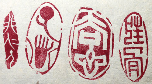 右3.6×1.2cm、・右中・3.5×2.2cm、左中3.6×1.7cm、左3.1×0.7cm 気晴らしの為に1時間程で刻した遊印四顆で、実にいい加減な物であるが、右 が篆文陽刻の「狂骨」で、右中が甲骨文陰刻の「去心」で、左中が金文陽刻の「 孑歩」で、左が金文陰刻の「非仁人」ある。右の三顆は寿山石であるが、左の 一顆は雞血石である。雞血石は寿山石に比べてやや堅く、若干刀が滑り易い 様に感じられた。 一寸遊び心で「狂骨もて心を去り孑歩するは仁人に非ず」と、篆文・甲骨文・金 文で洒落てみた。 |