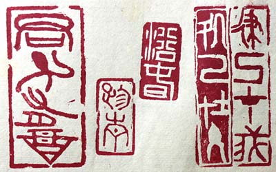 縦・横左右・・5×2.4cm、中央左右・・3.5×1.9cm、 徒然に二時間程で刻した時間潰しの四顆で、右が金文陽陰刻の 「律己在我、處己在人(己を律するは我に在り、己を處するは人 に在り)で、中央右が篆書陰刻の「浴春(春に浴し)」で、中央左が 古文陽刻の「踏青(青を踏む)」で、左が金文陽刻の「君子有酒( 君子に酒有り)」である。尚、この四顆は、一石の天地と側面左右 に刻した一石四顆である。遊び心で四面に刻したが、実際の押 印時は面倒くさく、手が汚れる。 |