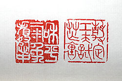 縦横・・2.6×2.6cm 宋の老荘研究家である林希逸の「力學(『宋百家詩存』)」と 言う詩の中に、「静定工夫忙裡試、和平氣象怒中看」と言う 二句が有り、甚だ蘊蓄に富んだ考えさせられる言葉である。 其處で、文字を一寸移動させ、朱白の金文で「静定工夫試忙 裏、和平氣象看怒中(静定の工夫は忙裏に試み、和平の氣 象は怒中に看る)」と刻してみた。 |