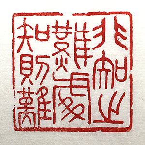 縦横・・4×4cm 『韓非子』の説難に有る言葉の一節で、古璽で刻した「非知 之難、處知則難(知の難きに非ず、知に處するは則ち難し) 」である。誠に意味深い言葉で、日本でも古來「じゃれる子 犬は可愛いが、纏わり付く子犬は蹴られる」と言われている 通り、知る事が重要では無く、知っている事に如何に對應す るかが重要であり、假に正しい事であっても、對處の如何に 因って相手を傷付けたり、己自身をも傷付けたりもする。 何事も對處は如何に難しいかと言う事を、肝に銘じておく必 要が有るであろう。 |