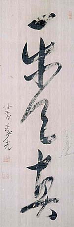 絹本肉筆・・縦118cm、横42.5cm 「仙鶴義光」の下に、陰刻「柳原義光」と陽刻「華 山」の落款が押されている。柳原華山は東京の 人で、名は義光、号を華山と称し、書を善くした伯 爵の貴族院議員で、叔母(父前光の妹)愛子は大 正天皇の生母と言う、幕末名門公家の出である が、むしろ白蓮事件の兄として有名である。妾腹 とは雖も伯爵家令嬢で、筑豊の炭坑王伊藤伝右 門の妻であった白蓮(柳原樺子)が、夫を捨てて 宮崎滔天の息子龍介と不倫の駆け落ちをしたた め、兄の義光は貴族院議員を辞職している。「天 真を樂む」の行書三字、妹樺子に思いを馳せて 書いたのであろうか、意味深い言葉である。 |