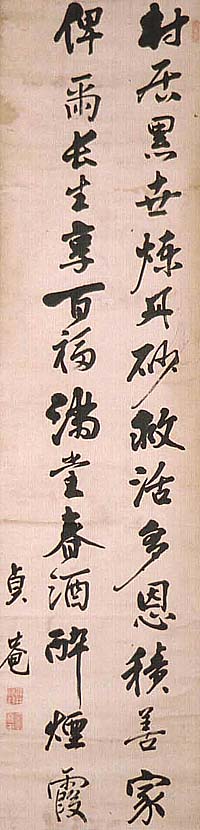紙本肉筆・・縦113cm、横30cm 「貞庵」の下に、陰刻「浅井政封」と「堯甫」の落款が押 されている。浅井貞庵は尾張の人で、名は政(正)封、 字は堯甫、号を貞庵・梅園などと称し、代々医科の家 に生まれ、京で医術を学んで藩医となり、宋学を中村 習齋に、漢唐の文辞を岡田新川に学び、博学多識で 凡百の技芸に通じたとも言われ、『中庸講義』等多くの 書籍を著した儒医である。『公羊伝補解』や『穀梁伝補 解』を著した幕末の儒者浅井節軒は、彼の孫である。 |