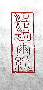 縦横・・5×1.86cm 春分を迎えいよいよ春本番となったが雨が降っている 爲、晩唐の詩人杜牧の七絶が頭を過ぎった。江南のこ の季節を彼は詠じて、「清明の時節雨紛々、路上の行人 魂を斷たんと欲す、借問す酒家は何處に有りやと、牧童 遙かに指す杏花村」と。 其處で小篆で刻した「清明雨紛々」(清明に雨紛々)であ る。しかし、何か間延びした様なバランスの悪い小篆に なった。改めて造形的感性の無さに呆れてしまう。 |