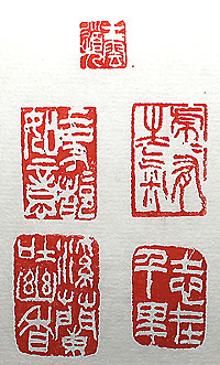 縦横・・1x1cm、2.4x1.6cm、2.4x1.6cm、2.3x1.6cm、2.7x1.9cm 病院に入院中に、無聊を慰める爲に病床で刻した五顆で、辭 書もメガネも無い状況で、即興的に刀任せで感覚的に刻した もので、篆刻云々の代物では無い。ガン切除の病床で石を刻 する等、愚の骨頂で酔狂の最たるものであろうが、愚かな己に は、これくらいしか無聊を慰める方途を思いつかなかった。 |