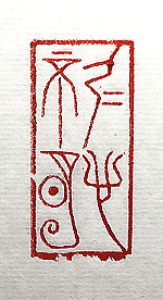 縦横・・4.4x2.1cm 河北省平山縣の戰國時代の中山國墓から出土した 遺物に刻されていたのが、所謂「中山國篆」であるが、 戰國金文とは異なり、縦長・婉曲・装飾の独特な造形 の文字である。今一般的に言われている古代文字の 變遷の流れからは、大きく外れた異質の文字である が、遺物が出土している以上、異質であろうが、傍流 であろうが、或る時或る地域で、文字として通用してい た事は明白である。其の中山國篆で刻した、「仁心不 明」(仁心明かならず)である。 |