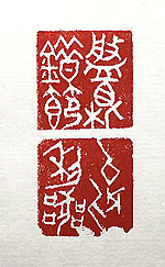 縦横・・2x2cm 『後漢書』虞詡傳の一節を刻したもので、金文で刻した 「槃根錯節」と、甲骨文で刻した「以別利器」(以て利器 を別つ)である。本傳には、「槃根錯節に遇はざれば、何 を以て利器を別たんや」と有る。平時であれば、利・鈍 など特段關係無いであろうが、槃根錯節の状況に在って は、利・鈍が明白になる。普段から何かに付けて「役に 立たない人だ」、と妻に罵倒されている己などは、「平時 安寧、以て鈍器を別つ」である。 |