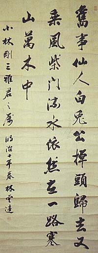紙本肉筆・・縦125cm、横53cm 林雲逵は広東の人で、生まれは清朝中期の の道光8年(1828)であるが、活躍したのは 清朝末期である。彼は書に堪能な商人で、 文久3年(1863)に長崎に来朝して明治16 年頃まで滞在し、この間学者や文人墨客らと 交流を重ねているが、特に書家の中林梧竹 と親交を持っている。本品は、「小林剛三雅 君之嘱明治十年(光緒三年・1877)春林雲 逵」の下に、陽刻「雲逵」の落款が押されて いる。 |