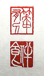 縦横・・2.2x2cm 『舊唐書』李義府傳と盧懐愼傳から各々一句を選び、共に 小篆で刻した「笑中有刀」(笑中に刀有り)と「伴食」である。 「笑中有刀」は、腹黒い人を指す言葉で、義府は一見微笑 み絶やさぬ温厚な人の様ではあったが、其の裏で常に陰 険な事を考えていた爲、時人がこの様に彼を評したと言う 。「伴食」は、要職に在っても其れを遂行する能力が無い 無能者を嘲笑う言葉で、政務を全て同僚の姚崇に任せき りだった懐愼を、世間が「伴食宰相」と稱した事に基づく。 因みに小生は、要職に就くと常に問題を起こし、任期途中 で必ず解任されると言う爲体で、教授會に顔を出す程度の 將に「伴食教授」でしかなかった。誠に身につまされる言葉 である。 |