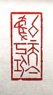 縦横・・5.2x2.5cm 『明史』張居正傳の一句を、甲骨文で刻した「以天下爲 己任」(天下を以て己が任と爲す)である。萬暦帝に仕え て、其の権力「主を震えさすに幾し」とまで稱され、専権 を振るった彼の自負の言葉である。居正は死後に弾劾 を被り、その後亦た評価された、功罪相半ばする政治家 である。専権を振るうのは甚だ良くないが、爲政者たる 者は、この様な氣概は持っていてほしい。 |