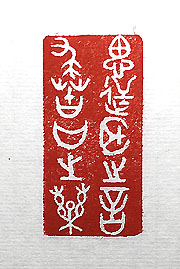 縦横・・5.1x2.5cm 『舊五代史』周世宗傳の一節を、金文で刻した「思逆耳 之言求苦口之薬」(耳に逆らふの言を思い、口に苦きの 薬を求む)である。周政権を打ち立てた郭威の養子とな り、周の二代世宗となった柴榮の言葉である。権力者は 得てして耳に順う言を思い、口に甘き薬を求めがちなも のであるが、柴榮は自ら其れを戒めた君主で、史官は「 一代の英主」と評している。 |