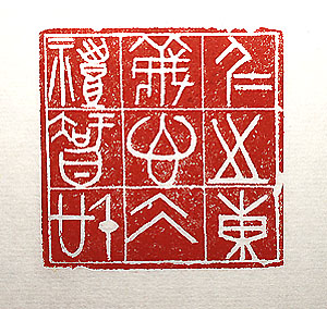 縦横・・6x6cm 半世紀(50年)以上に渉って教えを受け、亦た禄を賜っ た母校に對しては、萬感錯綜一言難盡の思いが有る が、學生時代から一貫して變らぬ思いは、この言葉で ある。古璽文で刻した回文の「仁之東義心大禮智信」 であるが、回文であれば「仁義禮智信は大東の心」と 讀む。「心」を中央に鎮座させる爲に、敢て回文に仕 立てたが、篆刻のルールや章法等を無視して、單に 己の思いだけを刻したに過ぎない。この言葉は、昭和 44年12月頃の十八歳時代に、習い覚えた漢語を見 様見真似で並べて作った、中文歌の一節である。 |