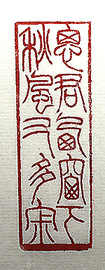 縦横・・7.5x2.5cm 昨日、人とは何と身勝手で我が儘な存在なのだ、と彊く 感じた。病院で入院の予定(十月入院手術・十一月入 院手術)が決まった。今年は三回も手術をする事にな る。やれやれと思っていたら、妻から自己管理がなって いない・おやつは食べるな等々小言を賜った。俺の躯 なのだから分かっている、もうごちゃごちゃ言うな等と思 ったが、一年前の昨秋に抱いた思いとは真逆であった。 何とまあ人とは、環境や立場の違いに因って、此處まで 意識が變わるものなのだ、と己自身の身勝手さに一人 苦笑した。其処で、一人暮らしを續けていた昨秋に感じ た思いを、改めて小篆で刻した「思君西窗下秋風又多 寂」(君を思ふ西窗の下、秋風は又寂多し)である。 |