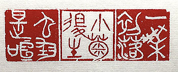 縦横・・2.5x7.7cm 此の二三日、吹く風がどことなく秋の氣配を感じさせる様に なり、夜も若干寝やすくなったが、待っていましたとばかり に秋の虫が一斉に鳴き出した。其處で、我が茅屋の小庭 の様子を、三聯印の戰國篆文で刻した、白文の「一葉初落 」と朱文の「小菊復生」と白文の「虫韻是喧」(一葉初めて落 ち小菊復た生じ虫の韻《ひびき》は是れ喧し》である。ベッド に入り虫の聲を聞くと、氣温は高くとも矢張り秋だなあと、 熟々感じる。思索の秋、感傷の秋であれば、少しは氣の 利いた漢語が思い浮かぶかもしれない。 |