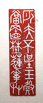 經・・8.1x2.5cm 筆者は元來田舎の貧乏神主の小倅にしか過ぎないの で、晴れやかな場とか高級なもの等は、未だに苦手で 性に合わない。白米が一番のご馳走と今でも思ってし まう悲しい輩であるが、沢庵で湯漬けを掻き込んだ時の 幸福感は何ともいえない。人は、其の人の身にあった環 境に身を置くのが良いのではなかろうか。吉川英治の『 三國志』では、曹操に厚遇優待された關羽が「匹夫は玉 殿に堪えず」と言っており、亦た江戸中期の播磨の俳人 滝野瓢水の作として、遊女を身請けし様とした友人を止 めて言った、「手に取るなやはり野に置け蓮華草」の句 が人口に膾炙している。この二句を金文で刻した、「匹 夫不堪玉殿當置野蓮華草」(匹夫は玉殿に堪えず、當 に野に置くべきは蓮華草)である。正直に言えば、在職 中は大學教授の金看板が重かった、其の名に相応しい 能力が無い事は、己自身が一番良く分かっていたが故 に辛く苦しい半世紀であったが、退職してやっと肩の荷 が降ろせてほっとしている。 |