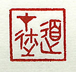 縦横・・2x2cm 有名な『孟子』離婁上の一句を、古璽文で刻した「道在邇」 (道は邇《ちかき》在り)である。何事も物事の本質は、己 の近い所に存在する、と言う事であるが、人は得てして遠 い所に其れを求め様とするものである。しかし、其れは己 の近場、否己自身に在る事が往往にして多い。故に己を 照らして内省する事が常に必要で、己の足下も見えない 様では、結局何も見えない事になる。然りと雖も、己を客 観的に内省する事は、甚だ難しい。どうしても己を贔屓目 に見てしまうのが、人の性であれば、「道は邇に在り」と言 っても、中々見つけられないのである。 |
