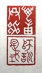 縦横・・2.4x2.4cm 『論衡』の雷虚篇に、「夫れ千里風を同じくせず、百里雷を共 にせず」と言う言葉が有るが、現代では一瞬にして同じ情報 が地球の裏側まで達する時代である。我々は、其れが正し いか否かは別として、ウクライナや中東の在り様を共有して いる。果たして其れが良い事なのであろうか、甲骨文で刻 した「萬邦共雷」(萬邦雷を共にす)と、『詩經』大雅烝民に 有る「古訓是式」をアレンジして金文で刻した「師訓是式」( 師訓是れ式《のっと》る)である。今の己が在るは、一に師 の教えに基づくものであれば、古訓ではなく師訓である。今 でも師訓は耳に在るし夢にも出て來る、K博士の「學僕たれ 」とH博士の「多讀と精讀だぞ」である。 |
