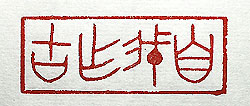 縦横・・2x5.2cm 後世の手本と成る様な前人未踏の事を、創意創作する態度を示 した有名な言葉で、慶應義塾大學の校訓にもなっている四字句 を、戰國篆文で刻した「自我作古」(我より古を作す)である。本 來この言葉は、『宋史』卷百二十二の禮志二十五に有る南宋の 孝宗の言葉で、崩御した高宗の葬服問題に就いて、王淮らの上 奏に對して孝宗が、「我より古を作す、何の害やあらん」、と言っ ているのに基づくいている。前例に無い様な事を、自ら始めよう とした時などに言う言葉である。では篆刻の章法なども真面目に 研鑽せず、矢鱈に石を刻しまくっている己は、我より古を作した ものかと言えば、答えは否である。己の愚行は、「我より將來の 笑いを作した」ものにしか過ぎない。 |