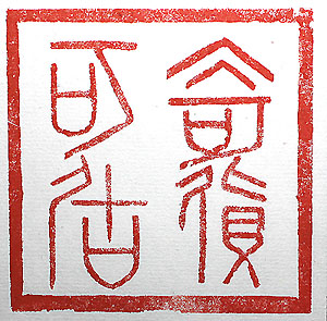 縦横・・7.5x7.5cm 大きな石に空間を多く取って文字を載せたら如何なる 見栄えになるのだろうか等々と、亦た亦た愚かな事を考 えた。其處で7.5センチ角に四字を置いて古璽文で刻 した「奇貨可居」(奇貨居く可し)である。出典は言うまで もなく有名な『史記』の呂不韋傳であるが、何處か何か 落ち着かない。もう1センチ程文字線が太くても良かった のかなあ、所謂「スタンプ的」な彫りになってしまったなあ 等々反省頻りである。 |