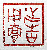 縦横・・2.3x2.5cm 『書經』盤庚の一句を金文で刻した、「誕告用亶」(誕《 おおい》に告ぐるに亶《まこと》を用てす)である。人に 何か言う時には誠が重要である。誠が無ければ聞いて ももらえないし、信用もしてもらえない。故に「亶」は重要 なのである。所で問題は「誕」の金文である。『金文編』 『漢語古文字字形表』が、この形を「誕」の金文形として 採取し、『字統』も其れに倣っているが、恐らく言偏の無 い「誕」の形であろう。「亶」は、金文の「圖」の中の部分 と「旦」の形とを組み合わせて作ってみた。 |