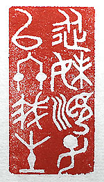 縦横・・5x2.5cm 昨年から今年にかけての數回に及ぶ入院手術等々、己 自身は何處か達觀した部分が無い譯では無かったが、 妻と娘達には口には出せない不安を抱かせ、特に妻に は特段の勞苦を懸けたであろう事は、想像に難く無い。 其れを思えば今後は何を言われても、彼女達の言に從 うに如くは無しである。金文で刻した「從妹順子以終我 生」(妹《つま》に從ひ子に順ひ以て我が生を終へん)で ある。 |