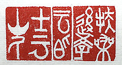 縦横・・2.5x2、2.5x0.9、2.5x2cm 理由は分からないが衝動的且つ突發的に、蝋の上に 押すスタンプ的なものが刻したくなった。其處で古璽文 で刻した三顆で、「扶桑後學」「雲伯」「士雲山人」(扶桑 の後學、雲伯の士雲山人)である。「扶桑」とは言うまで も無く日本の事であり、「雲伯」とは雲州と伯州が接する 地方の事で、古來より雲伯地方と稱した、己の生まれ 故郷である。「士雲」とは己の字で、山人・道人・散人 ・外史等を付けて、號として使っている。つまり「日本で 學んだ後學者で、雲伯地方の士雲と稱す田舎者でご ざいます」と言う意味である。 |