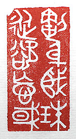 縦横・・5x2.5cm ロシアの某指導者の演説を聴いた。諸々感ずる所多々 逢ったが、改めて人の「欲」とは恐ろしいものだと思った 。「無欲」は言葉こそ耳に良いが、所詮無理を生じさせ てしまうし、人は「欲」が有ってこそ進歩する、故に「無 欲」は良くない、かと言って「大欲」はもっと良くない、「小 欲」「寡欲」で満足する心を持ちたいと思う。其處で『十 八史略』の中の一節から、金文で刻した「割身藏珠從 欲忘國」(身を割きて珠を藏し欲に從ひ國を忘る)であ る。 |