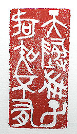 縦横・・5x2.5cm 『後漢書』の楊震傳に「三惑四知」と言う故事が有る。或 る人が賄賂を持って來た時、震は「この様な事は如何 に隠したからと言っても、天知る地知る我知る子《なんじ 》知るで、必ず發覚する」と言って拒否した、と傳えてい る。この話をアレンジして、金文で刻した「天地我子何 知不有」(天地我子、何の知ることか有らざらんや)で ある。 |
