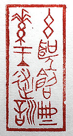 縦横・・5x2.4cm 『文心雕龍』原道篇の一句を、金文で刻した「玄聖創典 素王述訓」(玄聖は典を創め素王は訓を述ぶ)である。 此れは、伏羲氏が易を創作し、孔子が十翼を述作した 事、つまり『易經』が作られた過程を述べた言葉である。 己は若い時、漢易の話を鈴木由次郎(大先輩)先生か ら聞き、宋易を今井宇三郎先生から學んだが、未だに 良く分からない。單純な様であり亦た複雜でもあり、易 の哲理は深淵で己の理解を超えているが、占いの仕 方だけは、今でも覚えている。 |