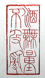 縦横・・5x2.4cm 『論語』郷黨篇の一句を、小篆で刻した「酒無量不及亂 」(酒に量無きも亂には及ばず)である。幾ら飲んでも決 して亂れないと言う事である。社家の生まれである己は 、子供の時から御神酒を飲んでいた、奉納される酒の 冷や酒の一杯は、殊の外美味しかった。しかし十代の終 わり頃、亂れる事は無かったが酒をしこたま飲んだ後、 歸り道の途中で雪中に倒れ込み、氣持ち良さで寝込み 一瞬命を失いかけた。故有って二十代で酒は止め、以 後はお付き合い程度であったが、昨年からの癌治療で 全面禁止となった。しかし、十代からの宿痾煙草は、未 だ止められないし、亦た止める意志も無い、實に困っ た事である。 |