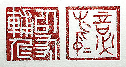 縦横・・2.4x2.4cm 『論語』先進篇と顔淵篇の一句を、古璽文で刻した「言必 有中」(言へば必ず中《あた》る有り)と、印篆で刻した「以 友輔仁」(友を以て仁を輔く)とである。得てして饒舌多言の 人は、何處か誤魔化しているのではないのかとついつい 疑ってしまう、逆に寡黙な人は、何か言った時には物事の 本質を鋭く指摘し、將に寸言人を射るの感が有る。亦た友 と交わる事に因って、己の仁を涵養し高めて行くと言う。で は己は如何と考えると、決して饒舌では無いが話し出すと 長いらしい、四十五年間も大學の教壇に立って喋り續けて 來た一種の職業病であろう。亦た仁を高めたか否かは分 からないが、友に恵まれ師に恵まれた事だけは事實であ り、師の叱責友の遠慮のない指摘等々が、今の己を作り 上げている事は明白である。 |