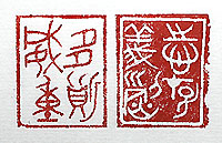 縦横・・3x2.4cm 『蒙求』の周處と王商の一句をそれぞれ金文刻した、「志 存義烈」(志は義烈を存す)と、「多質威重」(多質にして威 重)とである。白文は義興郡の人々から三害(虎・蛟・周 處)と悪まれていた處が、虎と蛟を殺し自らの行動を 改め名將と成った時の態度である。朱文は漢の成帝 が「真の漢の相なり」と感嘆の聲を擧げた、王商の 人となりの評語である。 |