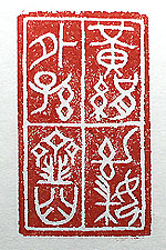 縦横・・5x3cm 『蒙求』の楊修の一句、有名な曹娥の碑を金文で刻した 、「黄絹幼婦外孫韲臼」(絶妙好辭)である。判字文で、 黄絹は文字にすると絶になり、幼婦は妙、外孫は好、韲 臼は辭となる。この碑を見た曹操が、「意味が分かるか 」と楊修に聞き、「分かる」と答えると曹操は、「俺が考え つくまで言うな」と言い、三十里進んだ所で理解したと言 う。故に「有知無知は三十里を校す」と喧傳されている。 |