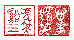 縦横・・2.4x2.4cm 共に金文で刻した、「心華獨笑」と、回印の「虎渓三笑」とで ある。「心華獨笑」は、元末の僧呉鎮の言葉で、『寶僧録』 を典據とし、悟りの境地を言い表した言葉である。亦た「虎 渓三笑」は、互いの話に熱中して時間も場所も忘れてしまう 事を言っているが、實際は時代の異なる慧遠法師と陶淵明 ・陸修靜の三人が、話に夢中になり過ぎてうっかり虎渓を渉 り大笑すると言う架空の話で、宋の陳舜兪の『廬山記』を出 典とする。 |