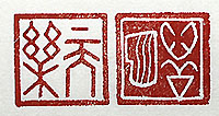 縦横・・2.4x2.4cm 『老子』第八章と『莊子』天道篇の言葉を、それぞれ甲骨文 で刻した「心善淵」(心は善く淵)と、「天樂」とである。心は 淵の如く深くて靜なるのが良いと言う。「天樂」とは、天と和 する事で、人と和する事を「人樂」と言い、無心の境地で萬 物に應じて、天と和し人と和し自然と一體化する。天樂が 適すと人樂は足り、人樂が適すと天樂が足り、自然を師と すると言う。 |