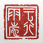 縦横・・3x3cm 『易經』の乾の一句を、古璽文で刻した「雲行雨施」(雲 は行き雨は施す)である。雲が出て雨が恵みを施し、萬 物を育成させる、所謂雲が出て慈雨が降ると言う事であ る。最近は慈雨ならぬ萬物を死滅させるが如き破風豪 雨が頻發しているが、此は我々人類が「發展」と言う錦 の旗の下で、地球を壊し續けて來た結果であろうか、さ すれば現状の氣候異常も、「因果應報」と言う事ではあ るまいか。 |