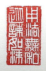 縦横・・5x3cm 『資治通鑑』卷二四九の唐の大中十三年の条に有る、 宣宗を評した言葉で、『舊唐書』に「李の英主、實に惟れ 獻文(宣宗の諡)」と稱された名君で、『通鑑』では「宣宗 は性は明察沉斷、法を用いては私無く、諫に從ひては流 るるが如く、重く官賞を惜しみ、恭謹節儉、民物を惠愛す 」と有る。其の中の一句を印篆で刻した、「用法無私從 諫如流」である。この様な指導者に邂逅する事は殆ど無 くなった。何處の誰とは敢て言わないが、諫を聞いても聞 き流し、法を用いては一見公平の様だが私が見え隠れす る、まあ其れが民意の反映と言うならば、其の咎は畢竟 己に還って來るものであろう。 |